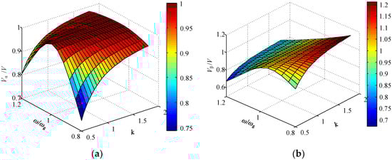 Graph of Vα/V and Vβ/V in ω/ωg from 0.8 to 1.2 and the damping constant k from 0.5 to 2. (a) Graph of Vα/V, ω/ωg, and k. (b) Curve of Vβ/V, ω/ωg, and k.