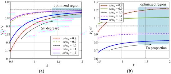 and Vα is increasingly smaller with decreasing k. The higher k is, the smaller the value of V minus Vα is. However, the quadrature-phase output voltage curve shown in Figure 10b had variation trends different from that shown in Figure 10a. When the input signal fluctuating with k was greater than 1, Vβ/V and ω/ωg had approximately linear relations and Vβ decreased as ω increased. The higher k is, the more this linearity improves.