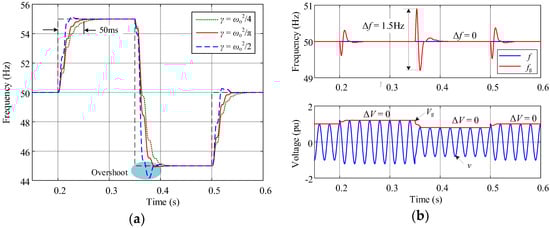 Figure 12 depicts the voltage/frequency dynamic response of SOGI-FLL when k4 was equal to 1.414. When the grid frequency jumped from 50 to 55 Hz at 0.2 s, from 55 to 45 Hz at 0.35 s, and back to 50 Hz at 0.5 s; γ was equal to /2, /π, and ωo2/4, respectively. The corresponding frequency dynamic response is shown in Figure 12a, where γ is the key parameter. Higher γ brought about a short settling time with higher overshoot (see the curve of γ = ωo2/4), whereas a lower γ obtained good stability without overshoot, but had a longer settling time, as depicted in the curve of γ = ωo2/2 with a 50 ms settling time. When γ was ωo2/π, it showed good dynamic characteristics without overshoot and good stability. The optimal value of γ is namely