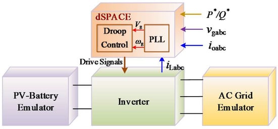 The control part of the PV–battery inverter consisted of inner voltage and current control loops, and outer P and Q droop control loops, assigning power by mimicking the static droop feature of a synchronous generator. The voltage and current control loops were to maintain the frequency and amplitude of the output voltage to the reference, which was regulated by the P and Q droop loops. Furthermore, the P and Q droop loops may adjust the R/X ratio of the output impedance “seen” by the inverter, which was composed of the power calculation, the power droop control, and the reference voltage generator. The inverter active power P and reactive power Q was obtained by calculating the inverter output current and voltage. The difference in active and reactive power (ΔP and ΔQ) was found via comparison with the corresponding reference active power P* and reactive power Q* from the PMS by the given optimization algorithm. Then, the angular frequency and voltage differences (Δω and ΔV) were obtained as the active power and reactive power PI controller outputs with ΔP and ΔQ as the relevant inputs. The inverter output voltage angular frequency reference ω* and amplitude reference V* were derived by tracking the output voltage angular frequency ωg and amplitude Vg by the phase-locked loop (PLL) and minus Δω and ΔV. ω* and V* had droop characteristics, which can be given by