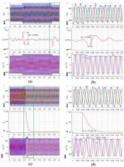 Figure 15 shows the grid voltage amplitude and frequency tracking transient response in the emulated adverse grid. Figure 15a,b depict the dynamic response of the locked amplitude Vg and frequency fg in amplitude transient and show the filtered positive sequence of grid voltage in the αβ-frame with good quality without dc offset and harmonics. Note that the proposed SOGI-FDE-PLL could filter dc bias and harmonics and extract a 0.9 pu positive sequence voltage. The estimated grid voltage amplitude Vg presented a fast response in one fundamental period without overshoot and had smooth dynamic features, whereas fg had oscillation in 0.25 Hz and the settling time was 2~3 periods, which can be neglected for the SPS with a ±5% fluctuation permit. Figure 15c,d depict the dynamic response of Vg and fg in the alternative frequencies of 40 and 60 Hz, as well as the smoothly positive sequence of the grid voltage. The locked frequency fg had a smooth response with a 0.5 ms settling time without any fluctuations that have adaptive features of auto-adjustment, whereas the locked voltage Vg oscillated with an 0.2 pu voltage deviation in approximately two periods settling time. For the low capacity of the PV–battery inverter when compared to the diesel generation system, this voltage deviation in two periods had little effect on the grid voltage. Hence, the proposed SOGI-FDE-FLL can capture grid voltage amplitude and frequency accurately and quickly in the vessel’s power quality problems of serious voltage/frequency swing, unbalanced voltage, subharmonic/dc-offset voltage, and LF/HF harmonics.