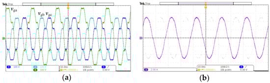 Measured grid voltage and injection currents of the PV–battery inverter in a steady state: (a) the emulated adverse grid voltage: 100 V/div, 10 ms/div; (b) the corresponding a-phase injection current ioa of the inverter: 2 A/div, 10 ms/div.