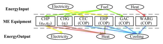 In order to illustrate the flexibility provided by the CCHP plant, several typical ME devices shown in Figure 1 are considered in this paper: 1. Combined heat and power (CHP) units. Electrical efficiency ηW and heat efficiency ηQ are used to describe the ratio of electric power output W and heat power output Q to the fuel thermal energy input F, respectively; 2. A CHP unit is typically sided by an auxiliary combustion heat generator group (CHG). Heat efficiency ηt is used to describe the ratio of heat power output to the fuel thermal energy input; 3. Compression Electric Chiller (CEC). Cooling power R for air conditioning or industrial purposes is conventionally generated by a CEC, whose compressor is driven by electricity; 4. Electrical heat pumps (EHP). EHP is an electrically driven bimodal machine that can serve both as a heater and a chiller; 5. Absorption chiller (WARG–Water Absorption/Adsorption Refrigeration Group). Cooling can be provided through a WARG [25] that produces cooling from a heat supply; 6. There are ME devices with other energy transforming mechanisms, which are less widespread, such as gas absorption chiller (GAC) and engine driven chiller (EDC), which are powered by mechanical compressors [25].