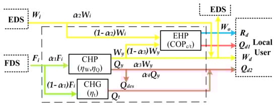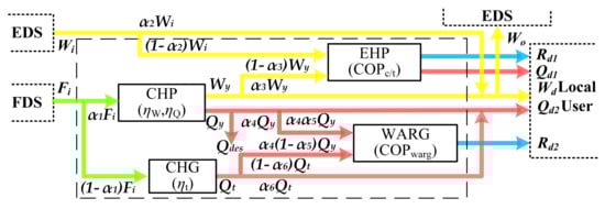 If we use and denote the output and input energy vectors, respectively, the mapping between them can be described with an efficiency matrix H as in (2). Fo, Wo, Qo, Ro denote the fuel output, electricity output, heat output, and cooling power output, respectively; Fi, Wi, Qi, Ri denote the fuel input, electricity input, heat input, and cooling power input, respectively. Each element in H relates one particular input to a certain output with relevant performance indicator, as defined in Table 1 [9,10,11]. ηFF, ηFW, ηFQ, ηFR denotes the ratio of fuel output and fuel input, electricity input, heat input, and cooling power input, respectively; ηWF, ηWW, ηWQ, ηWR denotes the ratio of electricity output and fuel input, electricity input, heat input, and cooling power input, respectively; ηQF, ηQW, ηQQ, ηQR denotes the ratio of heat output and fuel input, electricity input, heat input, and cooling power input, respectively; ηRF, ηRW, ηRQ, ηRR denotes the ratio of cooling power output and fuel input, electricity input, heat input, and cooling power input. respectively.