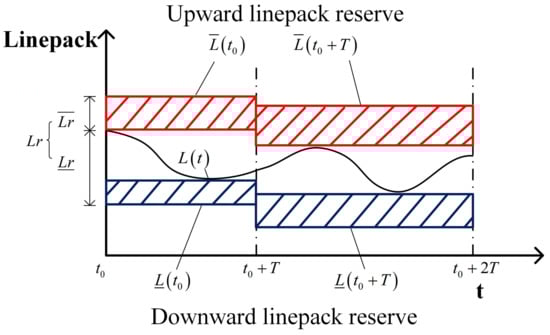 The timeframe over which the linepack reserve may be withdrawn for flexibility requirements is defined as the linepack reserve utilization period, T. T is dependent on the gas network as well as its scheduling capability. For larger gas networks, where changes to supply flows take longer to filtrate through the network before reaching demand, a longer linepack reserve utilization period should be considered. Meanwhile, for gas networks that actively manage their operation, for example, through the use of compressor stations, shorter timeframes should be considered [19]. In Figure 3, when the previous T ends and a new T begins, not only the present linepack, but the maximum linepack and the minimum linepack should be recalculated based on the maximum natural gas flow in this period. Thus, the upward linepack reserve and the downward linepack reserve will be renewed.