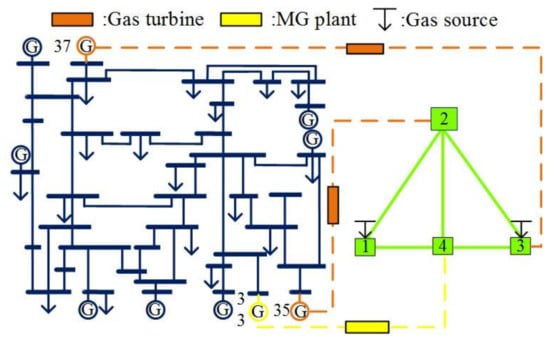 Two cases are conceived and tested on an IEGN consisting of the IEEE 39-bus system (case39.m from MATPOWER 6.5) and a natural gas network, as illustrated in Figure 6. The green natural gas network on the right and the blue electrical network on the left are coupled via three natural gas-dependent plants. Bus 33, 35, and 37 are connected with Node 4, 2, and 3, respectively. Details of two normal natural gas-dependent plants are listed in Table 2. Detailed parameters of the pipelines in the natural gas network are listed in Table 3. The linepack reserve utilization period T is set as 1 h. The natural gas price is 2.36 ¥/m3 for thermal and cooling power production, 2.51 ¥/m3 for electricity generation, and the selling price of electricity is 0.65 ¥/kW·h in 8:00–22:00 and 0.52 ¥/kW·h in other hours [30,31].