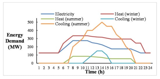 The number of times that the proposed methodology should be performed in a day is related to the resolution of the given energy demand data. For the energy demand profile in Figure 7, at least 24 times of optimization processes should be performed. For the simplicity of illustration, methodology is performed only once with the energy demand shown in Table 6. Consider that the separate generation efficiencies are , and COPSP = 3.5 [10]. The parameters of the NSGAII algorithm are set as follows: the population size is 200, the number of generations is 1000, the crossover probability is 0.9, and the mutation probability is 0.1.