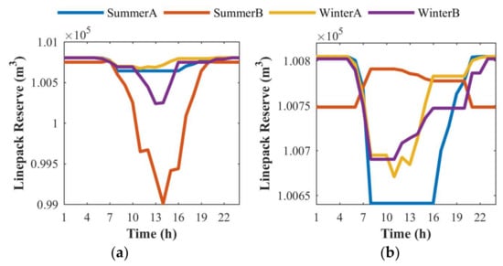 In Figure 9, Figure 9a shows the linepack reserve of the IEGN when the CCHP plant 1 is online and Figure 9b shows the linepack reserve of the IEGN when CCHP plant 2 is online. From Figure 9, we may clearly see the impacts of the CCHP plant configuration, CCHP plant energy dispatch, and the ME demands on the linepack reserve of the IEGN. The differences between Figure 9a and Figure 9b are mainly resulted from the configuration difference of the two CCHP plants. In one single picture, no matter Figure 9a or Figure 9b, the differences among four linepack reserve profiles are caused by the different energy demands and energy dispatch. Generally, linepack reserves in Figure 9a have a larger fluctuating range than those in Figure 9b, which is because with one more gas-dependent ME equipment-WARG, CCHP plant 1 can exert more influences on the IEGN linepack reserve. When Strategy A is followed, no matter in summer or winter, the linepack reserve are nearly the same (see Figure 9a,b). Because the heat and cooling production mainly relies on EHP under Strategy A, the natural gas demands of the two CCHP plants are nearly the same. When Strategy B is followed, the cooling and heat production for CCHP plant 1 mainly depends on WARG and CHG, which will push up the overall natural gas demand and reduce the linepack reserve. Especially when the cooling demand peaks at summer noon, the heat demand surge will result in the sharp drop in the IEGN linepack reserve.