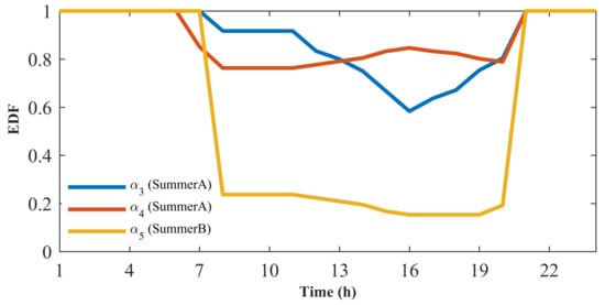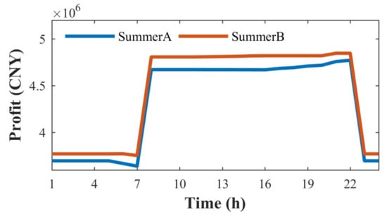 Besides the linepack reserve, the profits of IEGN are also influenced by ME devices. Figure 10 shows the profits of IEGN in summer when the CCHP plant 1 is online, and Figure 11 shows part of its EDF in a day. From Figure 10, the Strategy B is more profitable than Strategy A in summer, and the profit at night is lesser than in daytime, owing to the lower selling price and the lesser ME demands at night. At midnight, only electricity demand exists. Without thermal demand, the advantage of high efficiency of the CHP cannot be fully realized, which makes it more economical to purchase electricity from the EDS than produce by CHP. At noon, cooling demand peaks, while thermal demand is relatively small. Under Strategy A, EHP will undertake as much cooling demand as possible, which will cause CHP to increase the power supply for the EHP. As in Figure 11, α3 drops gradually from 1 at 6:00 to about 0.7. Besides, in the absence of thermal storage equipment, the cogenerated heat will probably exceed the demand and be wasted. As in Figure 11, the α4 drops gradually from 1 at 6:00 to 0.8 at about 13:00. When strategy B is followed, the abundant heat can serve the cooling production with WARG, thus decreasing the waste and increasing the profits. As in Figure 11, the α5 drops from 1 at 7:00 to 0.2 at about 13:00.