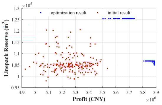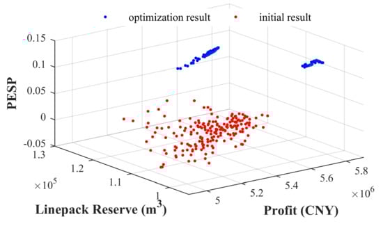 In Figure 12, blue optimized results, which are roughly composed of two groups of results, show the superior operation performance than the red initial results, especially the energy saving performance. Nearly a 10 percent rise in the energy saving performance is achieved, from −0.034–0.066 to 0.047–0.105, while one third of the initial results’ energy saving performances are in the negative territory. As to the profits and linepack reserve of the IEGN, the optimization results also outperforms the initial results, which could be seen from the projection of Figure 12, as illustrated in Figure 13. Though they cannot reach the maxima at the same time, the maximal profit rises from 5.538 × 106 to 5.888 × 106, and the maximal linepack reserve rises from 1.205 × 105 m3 to 1.255 × 105 m3. The optimized results in the upper left group could bring the IEGN more linepack reserve, which could secure the safe interactions between the electrical network and the natural gas network, while the optimized results in the lower right group could bring more economic benefits. The operators of the IEGN could select their ideal solution according to their preferences.