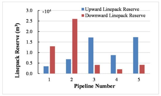 As the pipeline types and the natural gas flow that each pipeline transports vary, when the linepack reserve of a natural gas network is assessed, each pipeline must be calculated individually. Then, the sum of the linepack reserve of each pipeline are the linepack reserve of the natural gas network. For a natural gas network z with pipeline set Ωpipe, the upward linepack reserve , downward reserve and linepack reserve are as shown in (15) and (16),