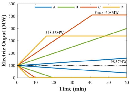 With the obtained linepack reserve, four scenarios are conceived to illustrate the ramping process of the gas turbine, as shown in Figure 15. Assume that the ramping rate of the gas turbine is 1 MW/min in Scenario A, 5 MW/min in Scenario B, and 10 MW/min in Scenario C, and the efficiency is 60%, as listed in Table 2. It could be seen that with adequate linepack reserve, gas turbines could ramp up to their maximum outputs, or ramp down to their minimum outputs. Besides, gas turbines with higher ramp rates could change outputs faster. Assume that the efficiency is changed from to 0.5% in Scenario D. In this scenario, linepack reserve is not enough for the gas turbine to ramp up to its maximum output in T. It ramps from 98.37 MW to 338 MW in about 16 min, and maintains that output for the rest of the T.