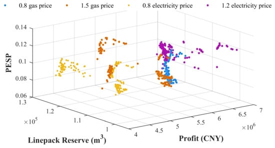 With the optimization results above, we may clearly see that the proposed optimal energy management method contributes to the significant improvement of the profits, linepack reserve, and energy saving performance of the IEGN. Besides, the impacts of the selling price of electricity, and the price of the natural gas are also investigated. 150% and 80% selling price of electricity, 150% and 80% natural gas price are, respectively, considered in the optimization process, and the optimization results are illustrated in Figure 16. From Figure 16, it could be seen that the changes in the selling price of electricity have bigger impacts on the operation performance of the IEGN than the changes in the natural gas price. The increase in the electricity price will promote the profit and energy saving performance, while they decrease the linepack reserve. The increase in the gas price will promote the linepack reserve and energy saving performance, while decreasing the profit.