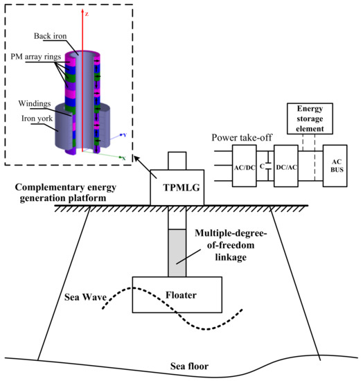 As shown in Figure 1, the proposed D-DWEC system is installed on a wind and solar photovoltaic complementary energy generation platform and comprises a TPMLG, floater, linkage, and power take-off (PTO). The TPMLG mainly consists of a stator with an asymmetric slot structure and pie windings and a steel translator with a circular cross-section where Halbach PM array rings of neodymium iron boron (NdFeB) are mounted. The floater is made of a hollow cylinder, and the linkage has multiple degrees of freedom, which can capture considerable kinetic wave energy and improve system efficiency. The PTO is required to control the power extraction and allow the integration of the D-DWEC into the electricity network or energy storage element.