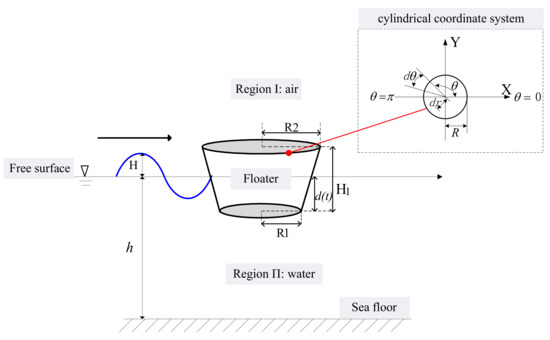 In Figure 2, h is the water depth, d(t) is the underwater penetration of the floater at any given moment t, H1 is the height of the floater, R1 is the bottom radius, R2 is the top radius, H is wave height, λ is wave length, and x is the direction of the wave transmission. Any point on the floater is expressed in the cylindrical coordinate system (r, θ, z) as follows: