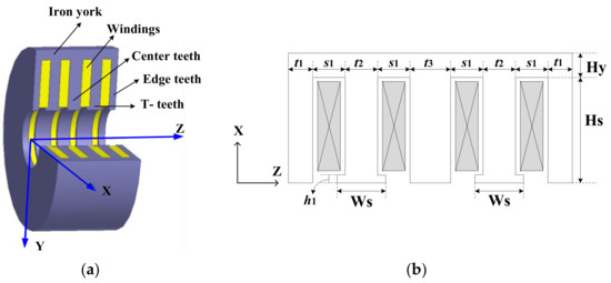 Figure 4 shows the stator structure of the TPMLG with an asymmetric slot. Figure 4a depicts a three-dimensional structure of the stator, which comprises windings, iron york, center teeth, edge teeth, and T-teeth. Figure 4b shows the main parameters of the stator. The asymmetric slot structure is applied to reduce the detent force and improve the air-gap flux density effectively. The four pie windings are connected to form a single phase to improve the amplitude of the output voltage.