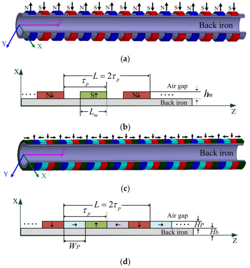 Figure 5 shows the translator structure of the TPMLG. Figure 5a,b illustrate translators with traditional PMs. Figure 5c,d present translators with Halbach PM arrays. Figure 5c,d show that, unlike the translators with traditional PMs, those with the Halbach PM arrays have axial and radial magnetization PM structures.