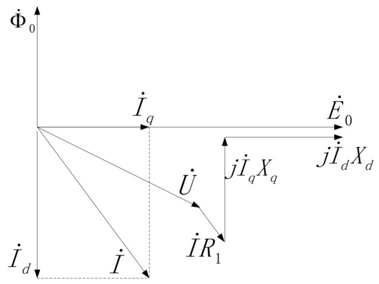 where Xad and Xaq are the direct-axis and quadrature-axis components of the generator reactance, respectively, and Id and Iq are the direct-axis and quadrature-axis components of the armature current, respectively. On the basis of Equations (6) to (8), the excitation E0 can be derived as follows: