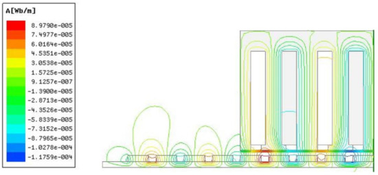 The static magnetic field distribution under no-load operation is depicted in Figure 7. The analysis of the dynamic characteristics, which is restricted to the no-load case at a constant velocity of 0.4 m/s, is shown in Figure 8. Figure 8a shows the flux linkage of the TPMLG, and Figure 8b illustrates the one-phase induced EMF waveform of the TPMLG. Figure 8b shows that a voltage peak value of 40 V is obtained.