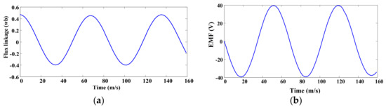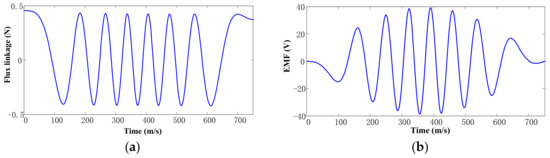 The flux linkage and EMF waveforms with time at a sine velocity of 0.4 sin (4πt/3) m/s are illustrated in Figure 9a,b, respectively. The period of sine velocity is 1500 ms; half of it is 750 ms, in which the velocity varies from 0 to 0.4 m/s. Figure 10 shows that the voltage peak value of the EMF waveform can reach 40 V.