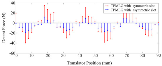 Detent force of the TPMLGs with asymmetric and symmetric slots.