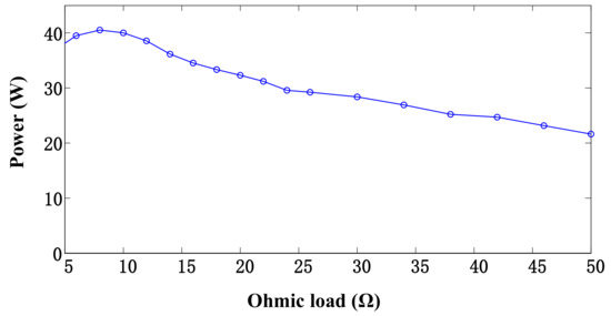 When connecting with different resistance values of ohmic load, the output power of the generator is calculated as shown in Figure 12. The maximum output power is 41 W when the load is 7.2 Ω, and the output power decreases and then stabilizes with a gradually increasing load.