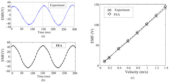 When the TPMLG runs at a constant velocity, its output EMF waveform can be obtained as shown in Figure 14. Figure 14a shows the EMF waveform, which is obtained through experiments at a constant velocity of 0.4 m/s, and Figure 14b shows the EMF waveform obtained through FEA at a constant velocity of 0.4 m/s. Figure 14c shows the comparison of the no-load EMF between FEA and the experiment at different velocities.