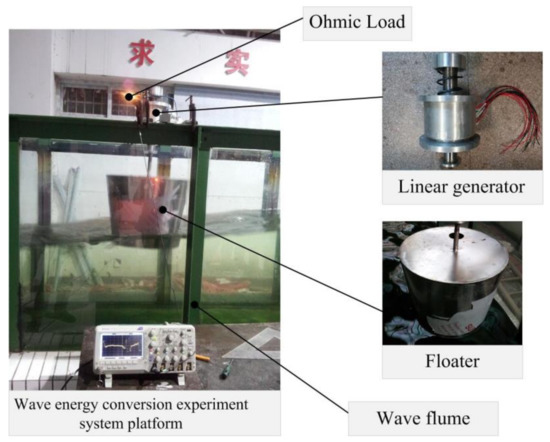 The height and width of the wave flume in the experiment system are 1.3 and 1 m, respectively, and the depth of the water in the wave flume is set as 0.73 m. The floater of the full-scale model is used in the experiment system, and the structure size of the floater is shown in Table 1 (Section 2.3). Waves with different heights and periods can be developed from the push plate of the wave flume, and the motion stroke of the generator can be adjusted by the water depth of the floater in the wave flume. With different wave parameters, test results can be obtained in the experimental platform system.