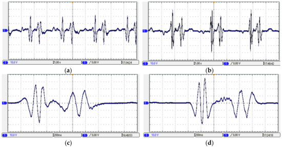 Figure 16a shows the one-phase output voltage waveform of the D-DWEC system that is obtained when the wave height is 0.15 m and the wave period is 1.5 s. Figure 16b depicts the one-phase output voltage waveform that is acquired when the wave height is 0.18 m and the wave period is 1.5 s. Figure 16c illustrates the one-phase output voltage waveform that is obtained when the wave height is 0.2 m and the wave period is 1.5 s. Figure 16d shows the one-phase output voltage waveform that is acquired when the wave height is 0.2 m and the wave period is 2 s.