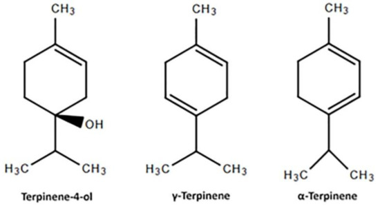 The oil of the leaves of Melaleuca alternifolia is commonly known as tea tree oil. This species is native to the Southeast of Queensland and the adjoining Northeast coast of New South Wales in Australia [18]. This oil has an oxygen content of around 5%. The main constituents of tea tree oil are terpinen-4-ol, γ-terpinene, and α-terpinene (shown in Figure 1). When compared to diesel, tea tree oil has a higher density, lower viscosity, slightly lower flash point, lower calorific value, significantly lower cetane number, and significantly lower induction time [19].