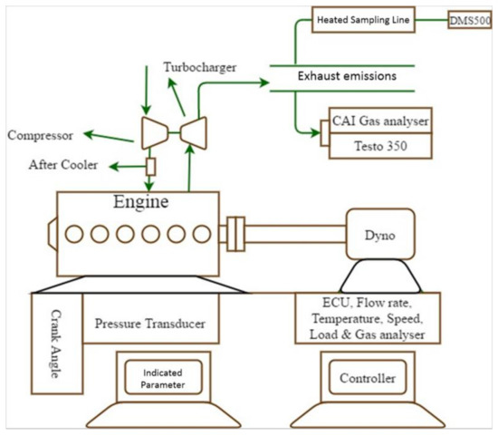 Running of the engine at 1500 RPM (i.e., max torque condition) was carried out at four different loads—25%, 50%, 75%, and 100%. At the beginning of each fuel cycle, the maximum load was therefore determined to be when the engine was at full throttle—1500 RPM (i.e., 100% load). After that, other loads were determined for that speed. The key engine specifications are given in Table 3, and a schematic diagram of the full engine test setup is provided in Figure 2.