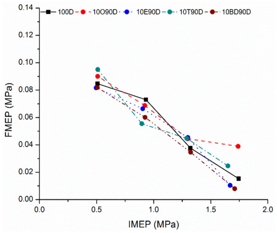Frictional Mean Effective Pressure variation of tested fuel blends.