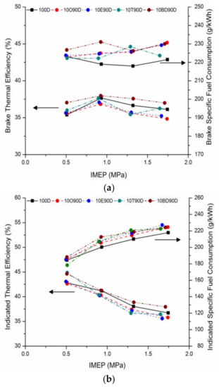 Thermal efficiency and fuel consumption variation of tested fuel blends: (a) Brake; and, (b) Indicated.