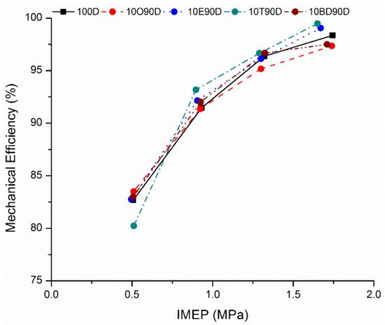 With increasing load, frictional losses decrease and mechanical efficiencies increase (Figure 6). At full load, ME is highest for 10E90D and 10T90D and lowest for 10O90D. This means that the eucalyptus-diesel and tea tree-diesel blends convert most of the input energy to output energy.