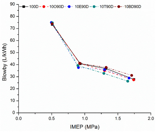 Engine blow-by is where pressure builds up and forces combustion gases to pass the piston rings and enter the crankcase as partly-combusted air-fuel. This phenomenon occurs mainly through the engine’s power stroke, although it may possibly also take place during compression strokes [22]. This pressure is not utilised in rotating the crankshaft, and so, blow-by is treated as lost efficiency. Engine lubricants are also affected by this blow-by, due to partially un-combusted air-fuel mixture passing into the crankcase. This can cause a decrease in oil longevity and an increase in engine wear [23]. Adding soot to the lubricant will alter the oil’s viscosity significantly, thus increasing the frictional losses in the engine. In turn, this leads to a further reduction of mechanical efficiency and increased fuel consumption [24]. The normalised blow-by equation is as follows: