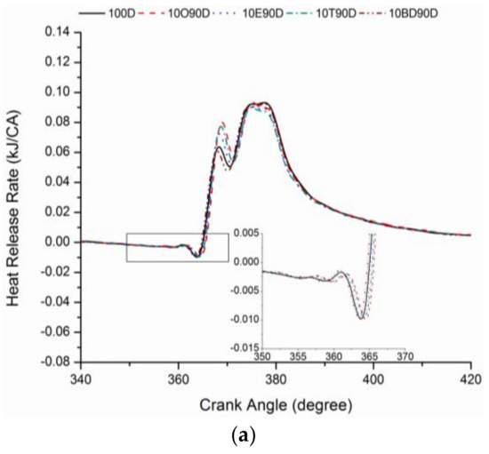 To study the combustion mechanism of the diesel engine, heat release rate (HRR) analysis was carried out using Equation (8), as derived by Heywood [25]. This analysis drew on the first law of thermodynamics, although heat lost through cylinder walls was not considered. Both the main combustion chamber and the pre-combustion chamber were combined to create a single-zone thermodynamic model. In between the two chambers, it is predicted that there will not be passage throttling losses. Fuel vaporisation, fuel mixing, gradients of temperature, and non-equilibrium conditions, along with pressure waves, can all be ignored. This method serves to simplify the identification of the SOC (start of combustion) timing, and variances in combustion rates from the diagram showing HRR versus crank angle. The HRR was calculated by using average in-cylinder data gleaned from 750 consecutive cycles.