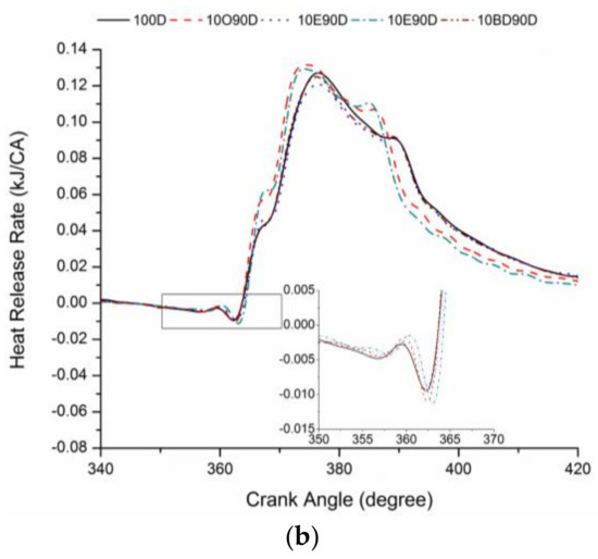 From Figure 9, it was quite evident that ignition starts later for all essential oil-diesel blends, which can be attributed to their lower cetane numbers and lower viscosities when compared to neat diesel. A longer ignition delay time will lead to the accumulation of combustible mixture inside the combustion chamber. Consequently, the peak heat release rate proved to be higher for essential oil blends when compared to neat diesel. Likewise, a number of researchers report a higher pre-mixed burning rate, and this is due to a longer ignition delay time, particularly when lower cetane fuels are used [2,33].