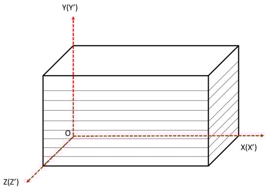 Since transverse isotropy is a characteristic of bedding shale, the orientation of rock material should be defined after parameter determination in the numerical modeling process. Thus, the local coordinate system of the material is established. For ease of analysis, the local coordinate system of the material is consistent with the original coordinate system (that is to say, X–X’, Y–Y’ and Z–Z’). In the model, XZ plane corresponds to the isotropic plane, while Y axis is perpendicular to the isotropic plane. The X axis direction is the direction of horizontal minimum principal stress, whereas Y axis direction is the direction of horizontal maximum principal stress (Figure 3).