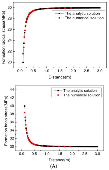 When p = q, the model is degenerated into a model under uniform in-situ stress, in which . A numerical example is given to verify the rationality of the model. The numerical and analytical results show that the numerical simulation is in good agreement with the analytical model, indicating that the numerical model established in this paper is reliable (Figure 4).
