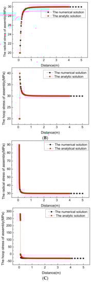Curve comparison of calculation result. (A) Drilling: The inner pressure is 20 MP; geo-stress is 30 MPa; (B) Cementing: The inner pressure is 20 MPa; (C) Hydraulic fracturing: The pump pressure is 90 MPa.
