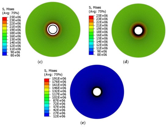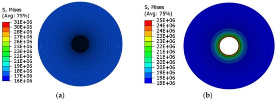 The parameters of the model are taken from a fractured well located in the Weiyuan area. The values of five engineering elastic mechanical parameters for shale material are set as follows: Poisson’s ratio and elastic modulus perpendicular to the isotropic plane are = 0.2 and = 20 respectively; Poisson’s ratio and elastic modulus parallel to the isotropic plane are = 0.18 and = 17 , respectively; and , are solved using Equations (3) and (4). The formation parameters are as follows: Permeability of formation fluid 0.1 × 10−3 μm3; porosity 3%; fluid saturation 1; reservoir fluid density 1 g/cm3; the pore pressure 10 MPa; overburden pressure 30 MPa; minimum horizontal principal stress 24 MPa; and maximum horizontal principal stress 30 MPa. The geometrical parameters, material properties and thermodynamic parameters of the model are listed in Table 1 and Table 2. In this paper, the maximum principal tensile stress criterion is used to determine whether the sheath is damaged.