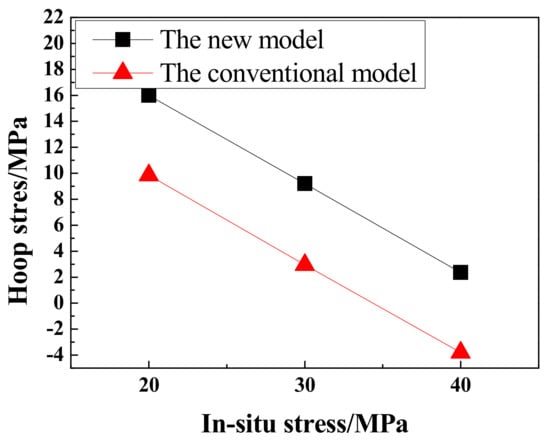During the fracturing process of shale reservoirs, the fracturing fluid is pumped into the formation, and the local in-situ stress field around the wellbore can be altered by fluid injection in fracturing operations of adjacent wells [14]. Figure 9 presents the influence of in-situ stress variation on the cement sheath hoop stress under the two models. The results showed that the hoop tensile stress of the cement sheath decreased gradually with the increasing in-situ stress, that is, the risk of tensile failure was reduced.