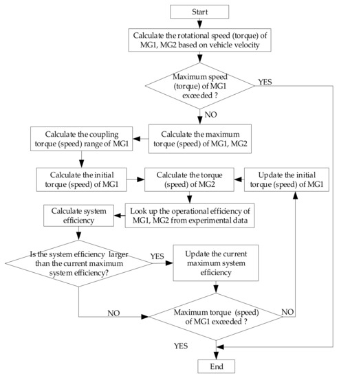 In Equation (4), ωo is the rotational speed of the final gear. The rotational speeds of the motors, ωm1 and ωm2, are proportional to the required rotational speed ωr. The output torques of the motors, Tm1 and Tm2, are coupled with the required wheel torque Tr, which can be regulated within certain ranges. At this point, the rotational speed of MG1 and MG2 can be calculated from the vehicle velocity, and the torque of MG1 and MG2 for the optimal system efficiency can be determined by an ergodic process [26], as shown in Figure 2 where the initial value of the current maximum system efficiency is assumed to be zero. The minimum and maximum output torque of these motors can be determined from the external characteristic curve of the motors.