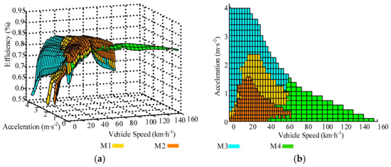 Following the establishment of the motor power model in different driving modes, the system efficiency maps and mode distribution results, can be calculated and then illustrated in Figure 3. Figure 3a shows the system efficiency maps for different driving modes under various driving conditions. These system efficiency maps are projected onto the speed-acceleration coordinate plane. For a given point on the vehicle speed-acceleration plane, the driving mode with the maximum system efficiency is selected as the optimal mode. The maximum efficiency ηopt is calculated using Equations (6) and (7). Then, the operating boundary of the four modes of NDMPS is obtained, as shown in Figure 3b.