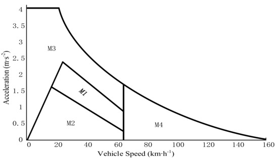 This paper proposes the vehicle longitudinal jerk to estimate the vehicle ride performance. The jerk intensity j is defined as the time derivative of acceleration (α), which must meet the national standard (the Chinese standard is 17 m/s3 and the European Union standard is 10 m/s3) [27]. The jerk intensity of M3 and M4 are modelled as Equations (8) and (9), respectively: