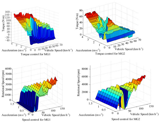 In the single-motor driving modes, the motor power is directly determined by the required speed and torque of the vehicle. In dual-motor torque coupling driving mode and speed coupling driving mode, the motor power can be regulated within certain ranges. Figure 5 shows the reference torque and the speed of two motors under a given vehicle speed and acceleration, where the driving mode is obtained by referring to Figure 4. The motor torque in M3 and the motor speed in M4 with maximum system efficiency can be calculated by referring to Figure 2. The energy recovery performance of the motors is also considered in this strategy. The vehicle controller can determine the required torques of MG1 and MG2 based on the real-time vehicle speed and acceleration. This power distribution strategy can ensure optimal system efficiency and it satisfies the dynamic requirements of vehicles.