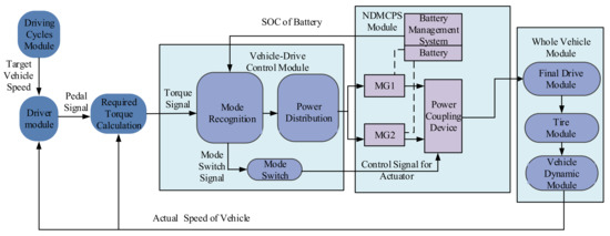 A simulation model for a PEV equipped with NDMPS was implemented in MATLAB/Simulink (R2014a), as shown in Figure 6. The simulation model includes a driving cycle module, driver module, required torque calculation module, vehicle driving control module, NDMPS module, and whole vehicle module. The control of the vehicle was implemented through real-time information transfer and cooperative operation of each module.
