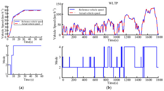 As shown in Figure 7, the actual vehicle speed tracks the reference speed very well, which indicates that the proposed control strategy can meet the requirement of vehicle dynamic performance. Figure 7a simulates the typical large acceleration process of vehicles, which included the switch of the four modes. The vehicle starts normally and accelerates rapidly to a certain velocity. Then, the acceleration pedal is released and the vehicle slowly accelerates to a relatively high speed. Accordingly, the simulation result shows that the vehicle starts with M2, and then switches to M1 and M3. Then, when the vehicle reaches a certain speed, it switches to M4. Figure 7b shows that the mode distribution and division logic can select and switch modes reasonably in the WLTP drive cycle.
