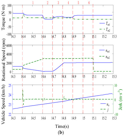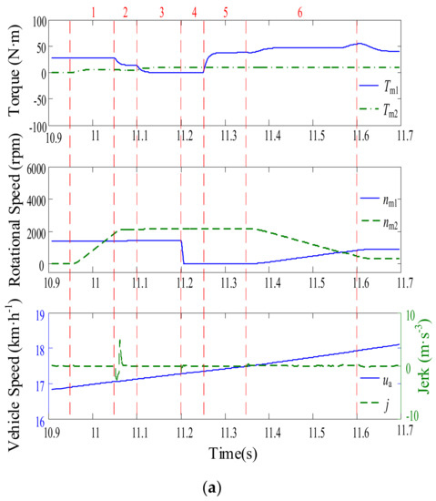 As shown in Figure 8a, 0.65 s is expended in switching from M1 to M4. The system initially operates in M1 and receives a signal to carry out a mode switch at 10.95 s. (1) From 10.95 s to 11.05 s, MG2 is started and accelerated until its speed reaches ωr·i0·i2·(k + 1); (2) From 11.05 s to 11.1 s, C3 is engaged after the clutch driving disc and the driven disc are synchronized; (3) From 11.1 s to 11.2 s, the torque of MG1 falls to zero and the torque of MG2 increases to Tr/i0/i2/(k + 1); (4) From 11.2 s to 11.25 s, C2 is disengaged and MG1 is stopped; (5) From 11.25 s to 11.35 s, C1 is engaged directly and the torque of MG1 increases to kTm2, equalising the torques on both sides of B1; (6) From 11.35 s to 11.6 s, B1 is released and the speed of MG1 and MG2 could be regulated within certain ranges. Finally, the system operates in M4.
