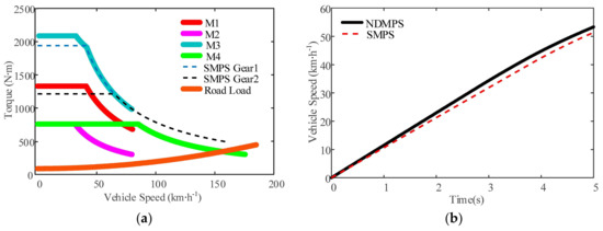 Figure 9 shows the dynamic performance of both the SMPS and NDMPS. As shown in Figure 9a, the SMPS and NDMPS have similar maximum torques under each vehicle speed. This similar external characteristic indicates that the parameters of the SMPS are well matched. Figure 9b presents the acceleration time of both powertrain systems. It shows that NDMPS has a better acceleration performance than the SMPS during vehicle launch. The details of the dynamic performance of both systems are presented in Table 6.